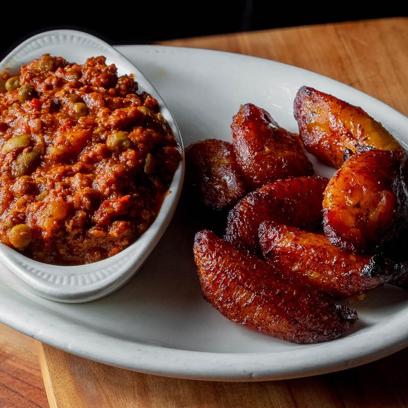 Golden sweet plaintains topped with warm cheese, served with a side of rich guava dipping sauce